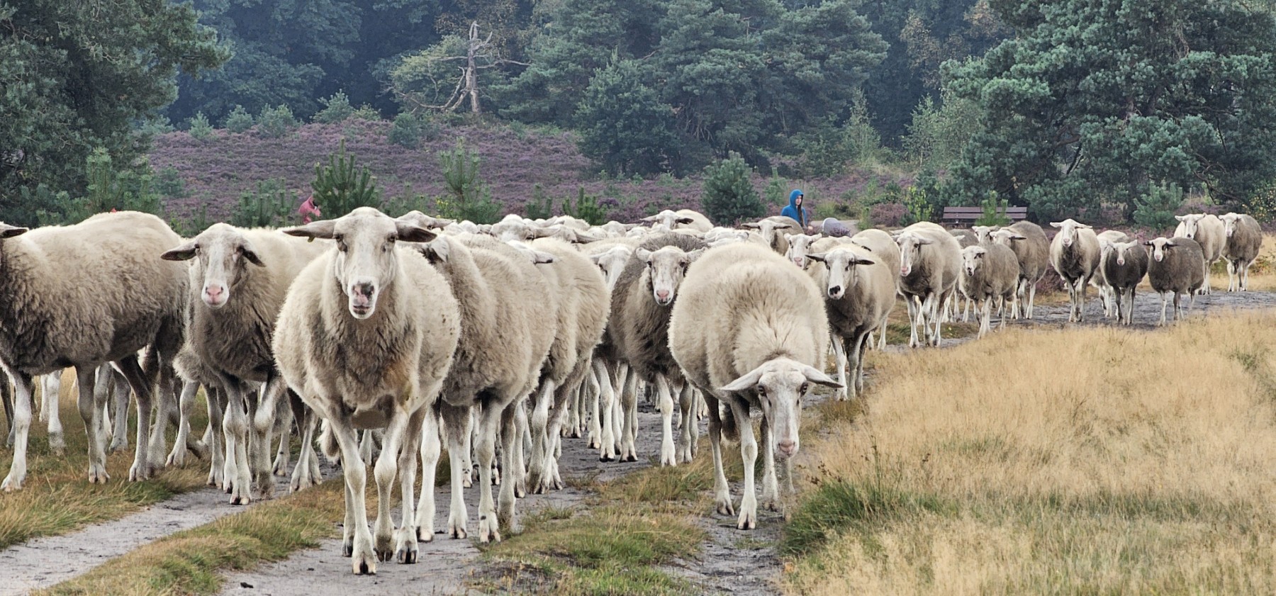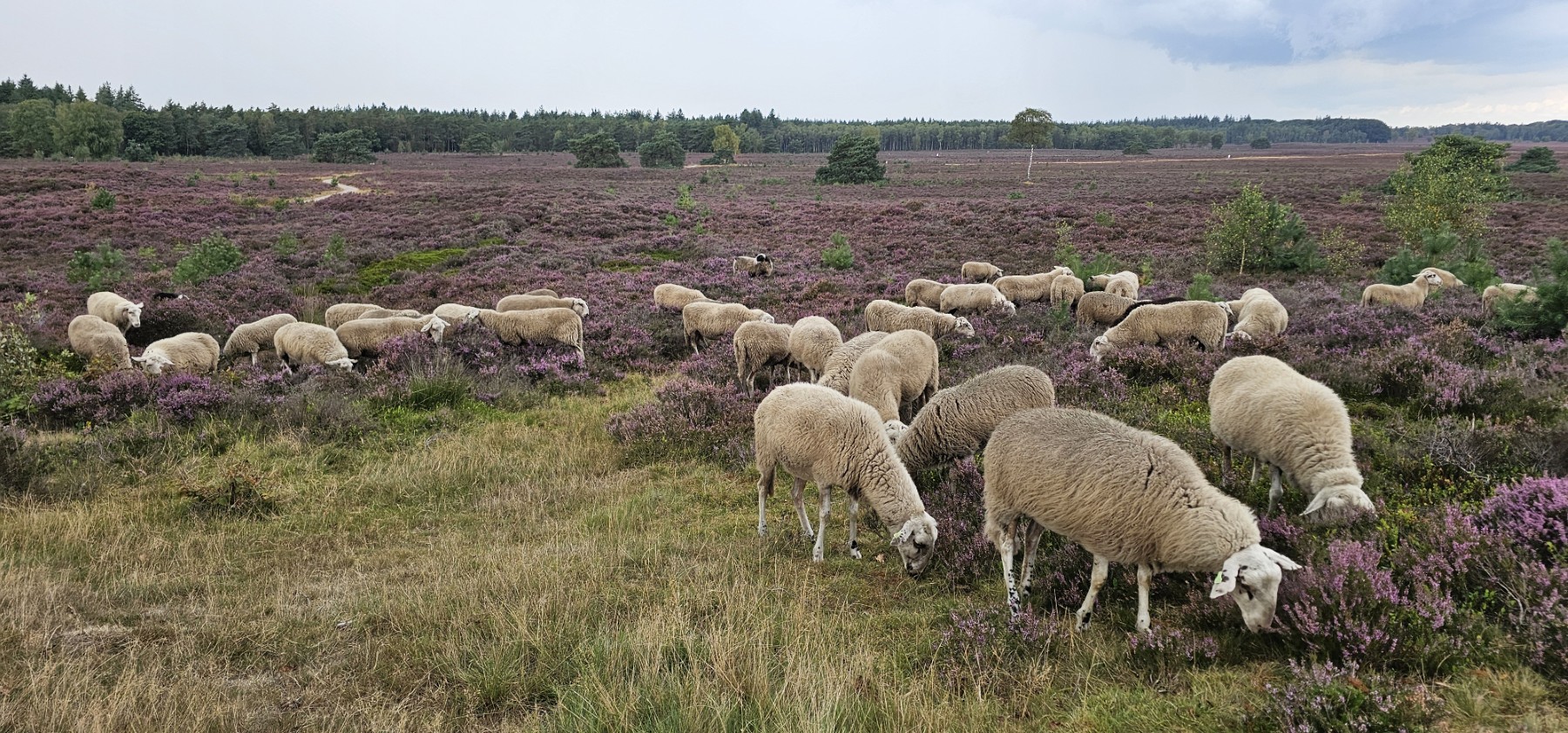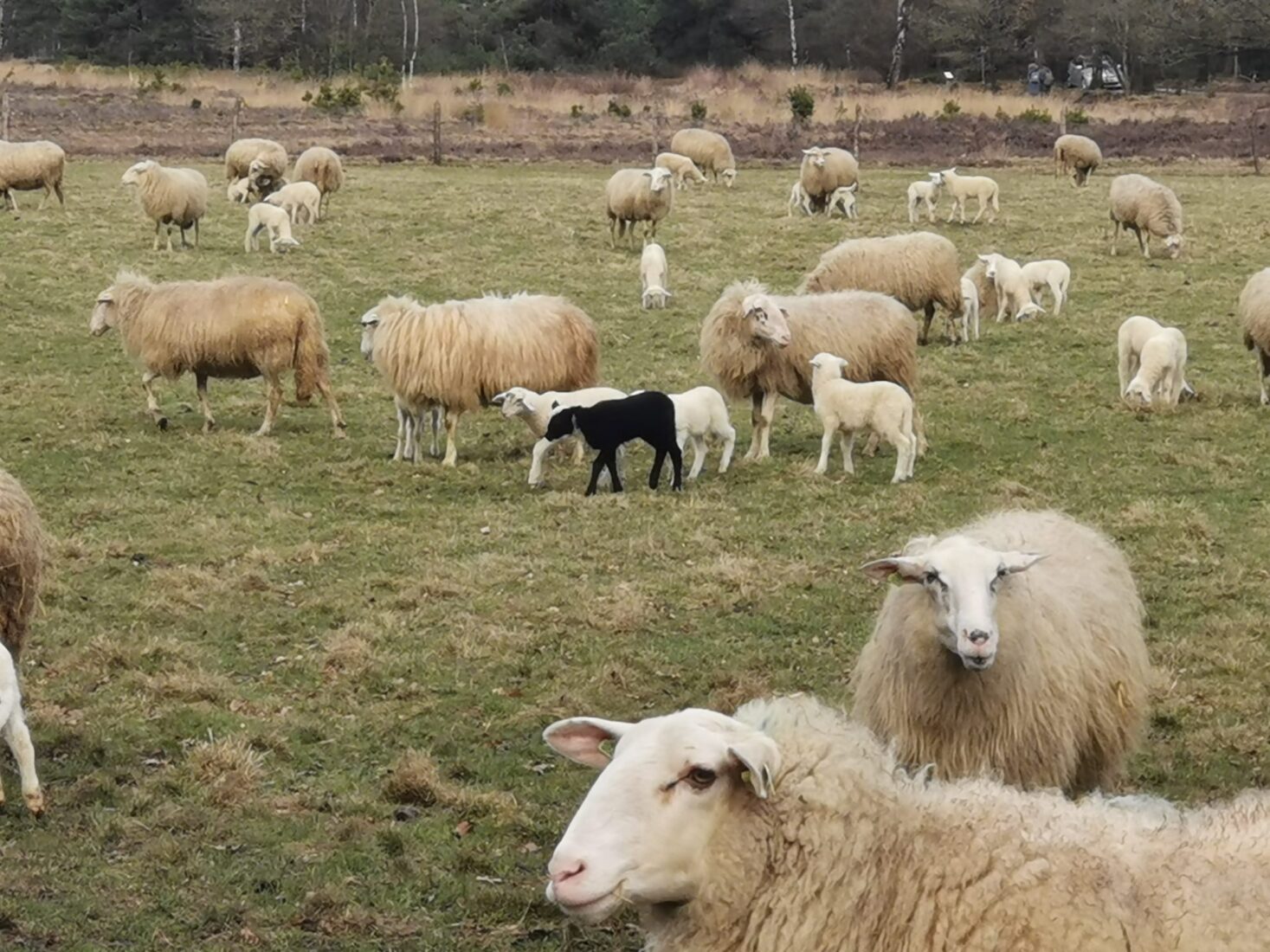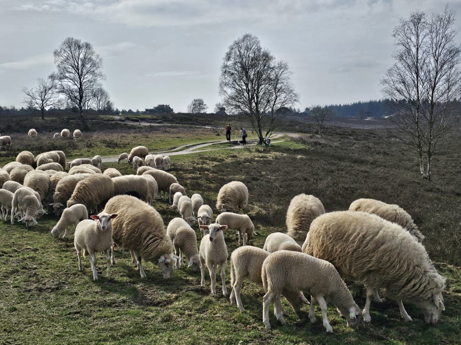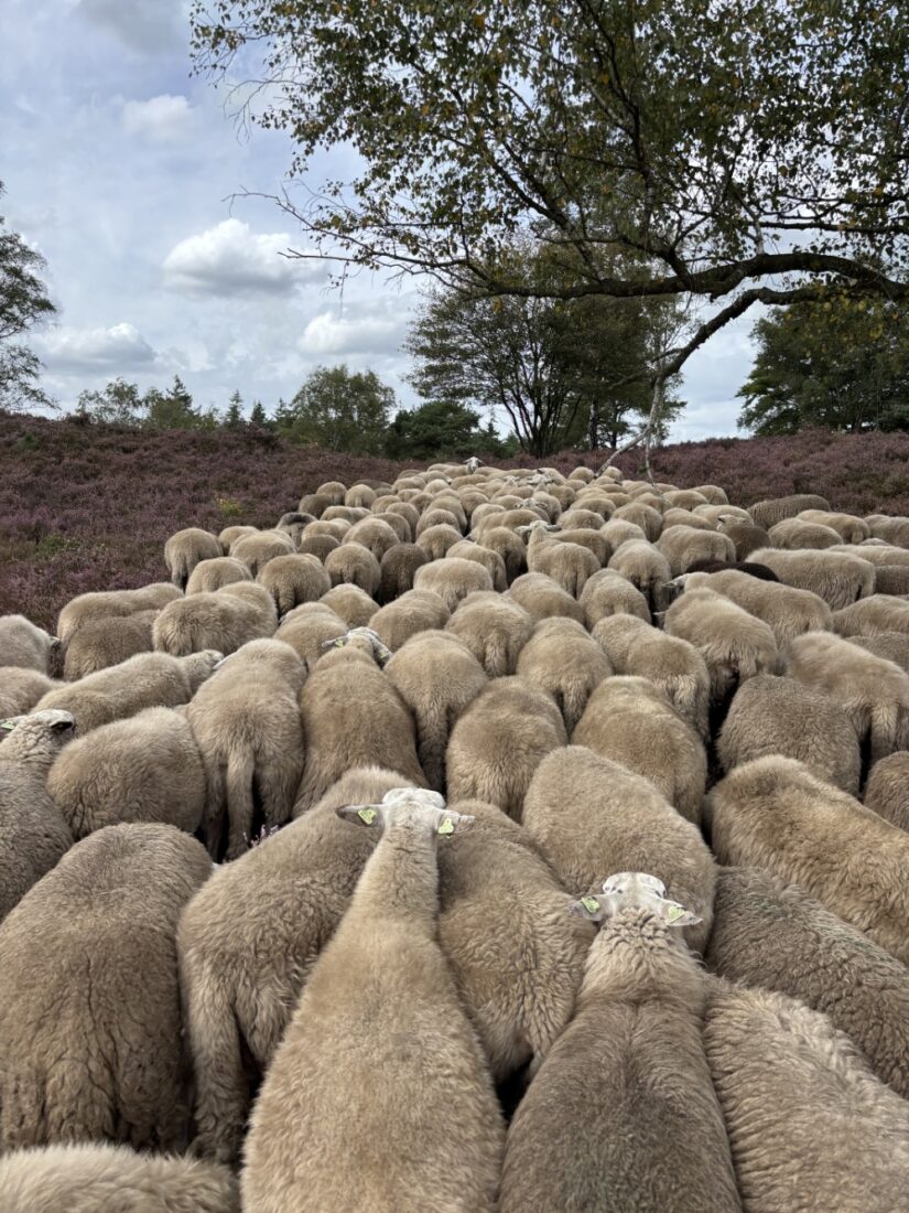 Onze kudde bestaat uit zo’n 140 Veluwse Heideschapen en is een ‘gescheperde’ kudde omdat ze elke dag onder (bege)leiding van een herder en zijn honden er op uit trekt. Meestal komt de meute aan het eind van de middag weer terug bij de schaapskooi.