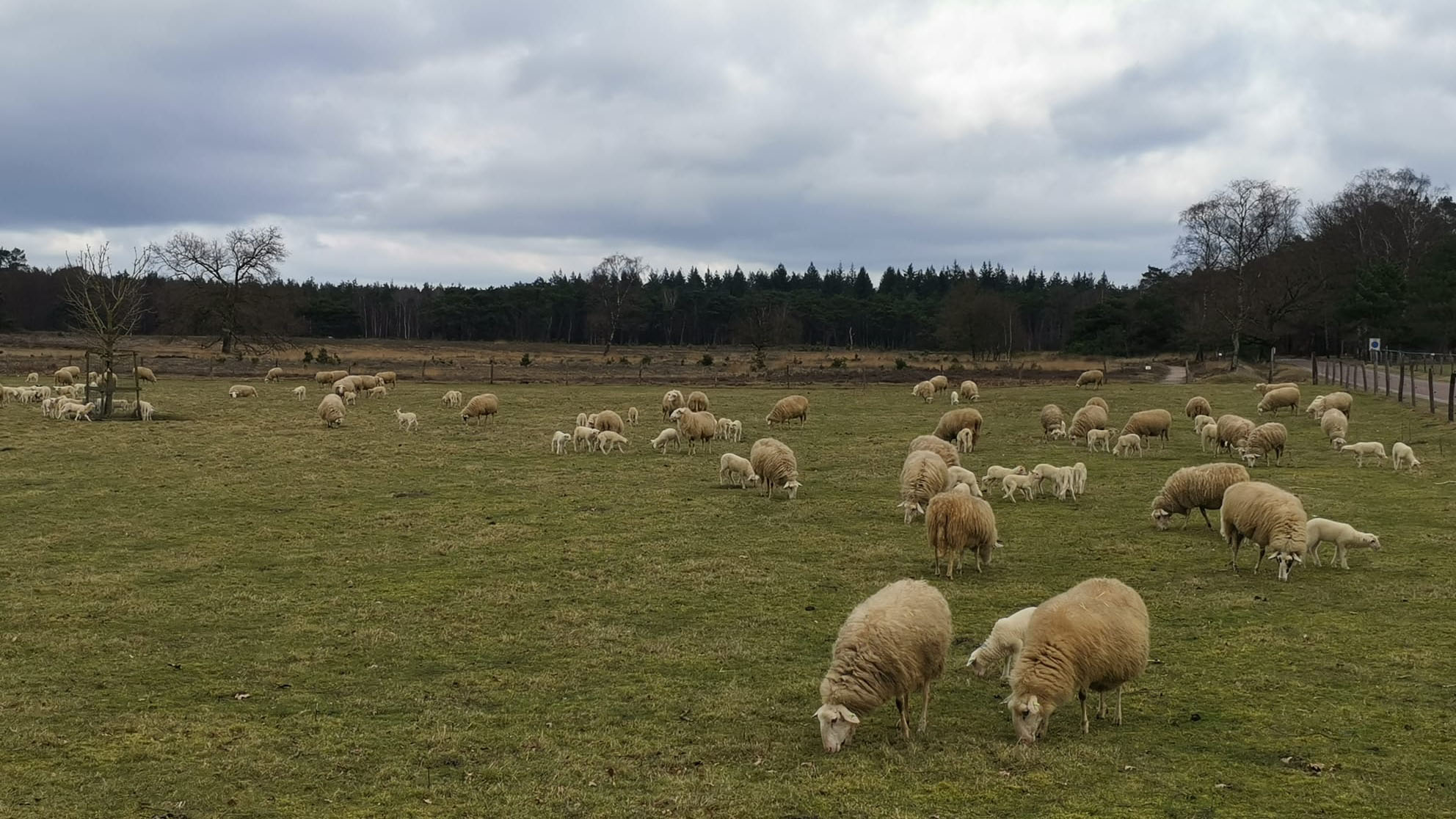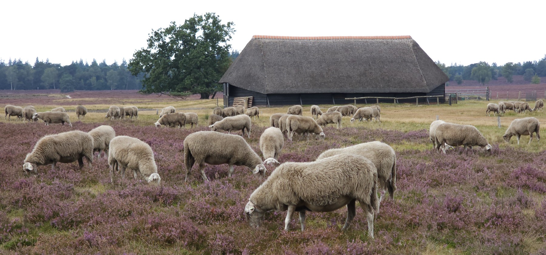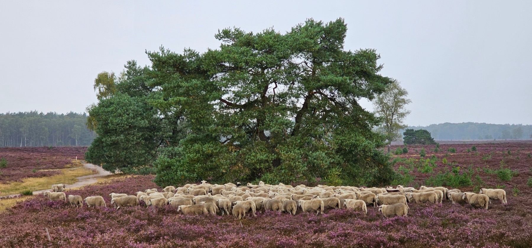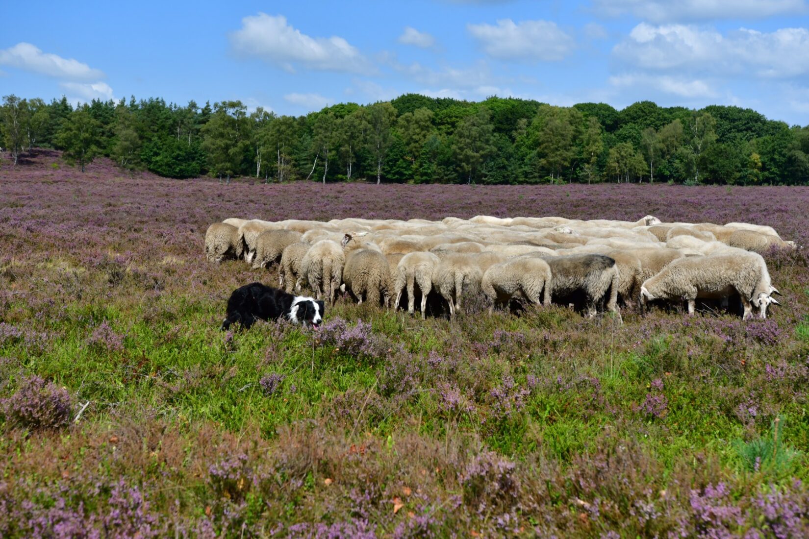 Onze kudde bestaat uit zo’n 140 Veluwse Heideschapen en is een ‘gescheperde’ kudde omdat ze elke dag onder (bege)leiding van een herder en zijn honden er op uit trekt. Meestal komt de meute aan het eind van de middag weer terug bij de schaapskooi.